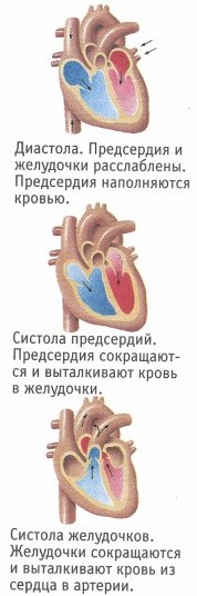Во время одного сердечного цикла оба желудочка заполняются кровью, а затем, сокращаясь, выталкивают ее из сердца. Когда сердце заполняется кровью, закрываются полулунные клапаны, предотвращая обратный ток крови - из аорты и легочной артерии в сердце. Когда желудочки выталкивают кровь из сердца в артерии, закрываются предсердно-желудочковые клапаны, не давая крови течь обратно в предсердия. Захлопываясь, эти клапаны производят характерный звук. Закрывание полулунных клапанов также сопровождается особым звуком. Два этих следующих друг за другом звука в основном и составляют тоны сердца, которые прослушиваются с помощью фонендоскопа. Ритм периодическим сокращениям сердца задает так называемый водитель ритма, находящийся в стенке правого предсердия.