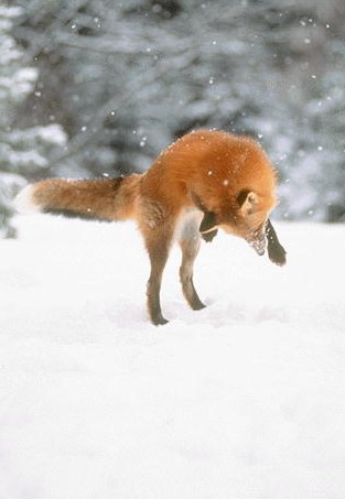 Зимним днем на заснеженном поле иногда можно увидеть своеобразное представление, которое лисица устраивает отнюдь не из "любви к искусству . Это — мышкование, очень характерный для лисицы способ охоты на мышевидных грызунов, устраивающих под снегом зимние гнезда.